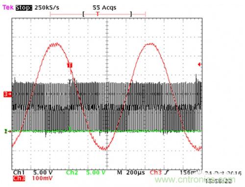 直列式電流感應方法看似是最合理的,因為這是最終要測量的電流。但這種方法存在一個問題。驅動MOSFET或IGBT的PWM信號對電流感應放大器造成嚴重破壞。感測電阻處的共模信號從電源電壓被驅動到接地,具有非??焖俚乃矐B(tài)開關特性,而電流感應放大器試圖測量感測電阻本身的小差分信號。圖2是由PWM逆變器產(chǎn)生的正弦相電流(紅色波形)的示波器截圖。這種情況下,PWM頻率為100兆赫(MHz),由LMG5200 GaN半橋功率級提供(更多詳細信息,請參見底部的TI設計)。需要注意的是,快速開關信號是直列式電流感應放大器測量相電流時所接收的信號。這就像在有颶風的情況下,當杯子在海上漂浮,而試圖測量杯中液體一樣。難怪大多數(shù)設計師會考慮使用低側感應!下面我們將介紹另外一種方法。