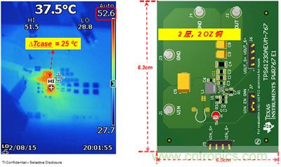 TPS61230A基于谷值限流模式控制方案,最小開關(guān)電流為4.8A。該器件集成了兩個低RDS(on)FET(18mΩ/高速,21mΩ/低速),這使其具有更高的效率和更良好的熱性能。在室溫條件下,VIN = 3.6V,VOUT = 5.0V,IOUT = 2.0A時,只能實現(xiàn)25℃的升溫,如圖3所示。