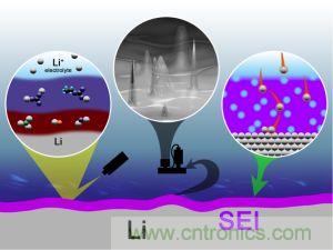 金屬鋰負(fù)極應(yīng)用繞不開的是鋰枝晶的問題,早期人們對(duì)于鋰枝晶的認(rèn)識(shí)主要來自于其他金屬電解過程中枝晶產(chǎn)生機(jī)理,對(duì)于鋰電池內(nèi)鋰枝晶形成機(jī)理更多是“猜測(cè)”。而在2014年,美國橡樹嶺國家實(shí)驗(yàn)室的Robert L. Sacci等「2」利用原位透射電鏡技術(shù)直接在玻璃碳表面觀測(cè)到了鋰枝晶的形成過程,從下面的動(dòng)畫可以看到,不同于傳統(tǒng)的枝晶的概念,鋰枝晶首先以球形出現(xiàn)的,其表面擁有一些納米球,這些納米球具有一定角度的小面,隨后的在一次鋰顆粒的表面進(jìn)行的二次結(jié)晶生長(zhǎng),會(huì)產(chǎn)生許多其他形狀的鋰