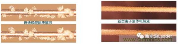 日本三重大學(xué)的Hui Wang等「3」開發(fā)了低濃度離子液體電解液,主要由溶解四甘醇二甲醚(G4或者G10H22O5),鋰鹽LiFSI,添加劑1,3-二氧戊環(huán)(DOL)組成,該電解液能夠有效的抑制鋰枝晶產(chǎn)生,在負(fù)極表面產(chǎn)生光滑的Li鍍層,提高金屬鋰負(fù)極的庫倫效率。鍍鋰后效果如下圖所示,從圖上可以看到采用新型電解液的銅電極表面鋰鍍層均勻分布(右圖),而采用傳統(tǒng)的碳酸酯類電解液的銅電極表面出現(xiàn)了大量的鋰枝晶(左圖)。