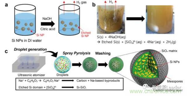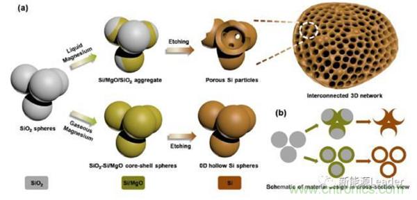 晶體Si的優(yōu)勢(shì)是容量高,首效高,缺點(diǎn)是體積膨脹大,為了克服這一問題,工業(yè)上一般是將晶體Si制成納米顆粒,分散在石墨之中,利用石墨吸收Si的體積膨脹。也可以將Si材料制成特殊形狀,例如Si納米線,蜂巢狀Si等。浙江大學(xué)的Hao Wu等「4」利用鎂熱反應(yīng)制成了蜂窩狀的硅材料,如下圖所示,獨(dú)特的蜂窩狀結(jié)構(gòu)能夠很好的吸收Si的體積膨脹,顯著改善了循環(huán)性能,循環(huán)800次容量仍然可達(dá)1058mAh/g,容量保持率為91%。