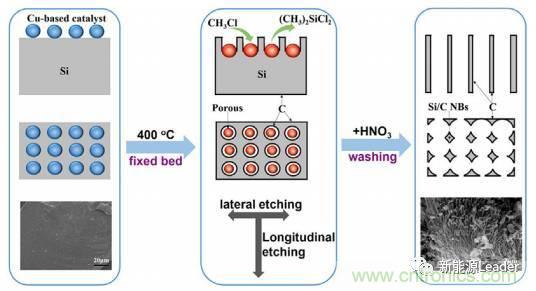 將Si材料與石墨復(fù)合也是克服Si體積膨脹的重要途徑,也是目前唯一上也化運(yùn)用的方法。來自中科院過程所的Wenfeng Ren等[5]提出了一中新型的Si-C樹枝狀復(fù)合結(jié)構(gòu),如下圖所示。該方法首先在工業(yè)級(jí)多晶硅的表面分散一層銅基催化劑,然后在CH3Cl氣氛下,利用該催化劑對(duì)Si基體進(jìn)行腐蝕,最終獲得樹枝狀的Si材料,這些Si晶體之間的空隙能夠很好的吸收體積膨脹,同時(shí)CH3Cl分解后會(huì)在Si表面形成一層無定形碳對(duì)Si形成保護(hù),該材料在50mA/g的電流密度下,比容量可以達(dá)到849mAh/g,并具有良好的循環(huán)性能。
