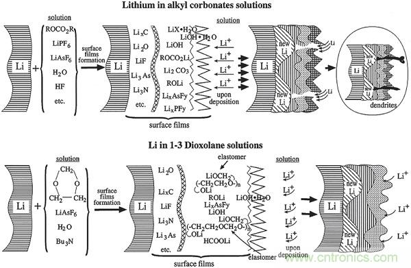 通常,本征SEI層由各種有機(jī)物(低聚物和聚合物)和無機(jī)物組成,其中有機(jī)部分賦予SEI層柔性以適應(yīng)鋰沉積,而無機(jī)部分能夠?qū)崿F(xiàn)快速的鋰離子傳輸。然而,無機(jī)碳酸鋰(Li2CO3)和鋰乙烯碳酸氫鈉(LEDC)作為兩個(gè)主要的SEI組分,在鋰沉積電位附近是熱力學(xué)不穩(wěn)定的,并且允許循環(huán)中反應(yīng)發(fā)生,而氧化鋰(Li2O)是唯一的熱力學(xué)和動(dòng)力學(xué)穩(wěn)定的組分,最里面的SEI層中的Li2O薄層是非常重要的,以避免在沒有氟化物源的情況下破裂。此外,化學(xué)和物理各向異性在SEI層內(nèi)是常見的,同時(shí)導(dǎo)致異質(zhì)鋰通量和不均勻沉積。沉積和溶解時(shí),由無機(jī)離子香料組成的表面不能適應(yīng)形態(tài)變化,因此可能會(huì)分解,導(dǎo)致高度不均勻的鋰沉積,使得枝晶形成。迄今為止,選擇合適的溶劑、鋰鹽和添加劑可以有效和高效地調(diào)節(jié)SEI層的性質(zhì)。