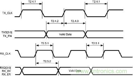 DT6000S項(xiàng)目上有4路光以太網(wǎng)接口連接到FPGA,由FPGA進(jìn)行實(shí)現(xiàn)MAC層和解碼IEC61850的SV和GOOSE。以太網(wǎng)PHY通過(guò)MII接口和FPGA,因此FPGA與外部的接口有4路MII接口。項(xiàng)目初期是實(shí)現(xiàn)1路光以太網(wǎng)接口,并且驗(yàn)證功能正確之后,但是后期變成的4路光以太網(wǎng)時(shí),總會(huì)存在1路光以太網(wǎng)通信不正常。經(jīng)過(guò)分析得到是FPGA通MII接口和PHY的時(shí)序不滿足。如圖 9所示為MII接口的時(shí)序圖,時(shí)序不滿足分為T(mén)X_CLK和RX_CLK。