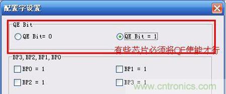 芯片中的配置參數(shù)需要手動(dòng)修改,不能單純的加載文件后直接進(jìn)行燒錄,如果不按照正確的規(guī)則設(shè)置參數(shù),必然會導(dǎo)致芯片無法正常運(yùn)行。在SPI Flash的芯片燒錄時(shí)經(jīng)常遇到這類問題,類似于”QE”位必須使能,如下圖。