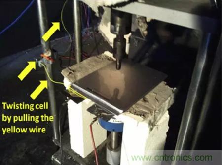 目前能夠模擬鋰離子電池內(nèi)短路的方式有多種,例如針刺測(cè)試,小壓痕測(cè)試,BAJ測(cè)試和機(jī)械擠壓測(cè)試等,通過(guò)對(duì)大尺寸方形電池特點(diǎn)的分析,Hsin Wang認(rèn)為機(jī)械擠壓測(cè)試最適合應(yīng)用方形鋰離子電池的測(cè)試上。但是在傳統(tǒng)的擠壓的測(cè)試中由于電池受到的破壞太大,幾乎所有的電池都會(huì)發(fā)生熱失控,因此傳統(tǒng)的擠壓測(cè)試對(duì)不同種類電池安全性的“分辨率”就很低,只有通過(guò)和不通過(guò)兩種結(jié)果,只能對(duì)鋰離子電池的安全性進(jìn)行定性分析??赡軆蓚€(gè)電池都沒有通過(guò)安全性測(cè)試,但是A電池的安全性卻要好于B電池,為了能夠準(zhǔn)確的評(píng)估不同體系電池的安全性能,Hsin Wang對(duì)傳統(tǒng)的擠壓實(shí)驗(yàn)進(jìn)行了改進(jìn),通過(guò)在電池負(fù)極極耳上施加一個(gè)拉力,讓電池產(chǎn)生大約5°的扭曲,從而減少在擠壓過(guò)程中電池受到的破壞,因此該實(shí)驗(yàn)?zāi)軌驕?zhǔn)確的評(píng)估不同種類電池的的安全性高低。