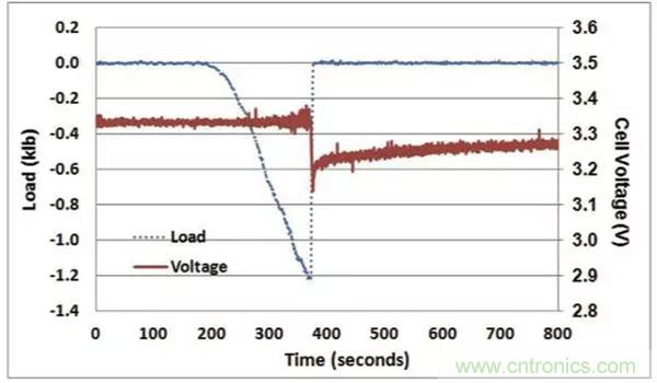 為了方便讀者理解本文,下圖是給出了LFP電池一個(gè)非常典型的成功通過(guò)機(jī)械擠壓測(cè)試(正反饋)的判據(jù),電池?cái)D壓變形達(dá)到一定的程度后,引起了電池內(nèi)短路的發(fā)生,電池電壓迅速下降,檢測(cè)到電壓下降后(0.1V),擠壓力隨之被移除,電池的電壓快速回升,電池沒有發(fā)生熱失控,則電池通過(guò)擠壓實(shí)驗(yàn)。