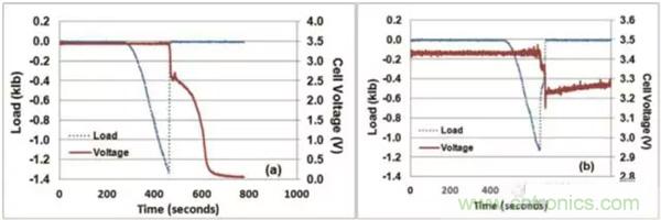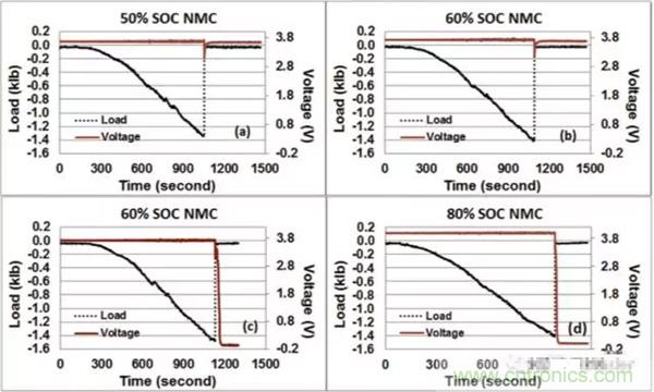 在對(duì)25Ah的NMC電池?cái)D壓-扭轉(zhuǎn)測(cè)試中,發(fā)現(xiàn)50%SoC狀態(tài)下的電池都成功通過(guò)了測(cè)試,如圖a所示,60%SoC狀態(tài)下的電池有三只通過(guò)了測(cè)試,如圖b所示,另外的三只沒有通過(guò)測(cè)試,如圖c所示,可見60%SoC的電池通過(guò)測(cè)試和不通過(guò)測(cè)試的概率各為50%,而80%SoC的電池則都沒有通過(guò)測(cè)試,如圖d所示。由此可見,60%SoC是NMC電池安全性的一個(gè)分水嶺,低于這個(gè)數(shù)值時(shí)電池相對(duì)是安全的,高于這個(gè)數(shù)值,則電池在機(jī)械濫用的情況下的安全性將大大下降。