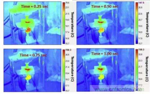 下圖為60%SoC的NMC電池在擠壓-扭轉(zhuǎn)實(shí)驗(yàn)中的熱成像圖,從圖中可以看到在短路發(fā)生后,短路點(diǎn)的溫度在0.5S內(nèi)迅速升高到了147.5 ℃,隨后高溫區(qū)域迅速向周圍擴(kuò)展,說(shuō)明周圍區(qū)域溫度升高并不是由熱傳導(dǎo)導(dǎo)致的,而是高溫引發(fā)了其他的化學(xué)反應(yīng)。而在80%SoC下,NMC電池發(fā)生熱失控的溫度更高,引起周圍化學(xué)反應(yīng)的速度也更快。
