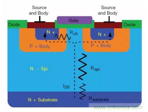 圖1顯示了一種傳統(tǒng)平面式高壓MOSFET的簡單結(jié)構(gòu)。平面式MOSFET通常具有高單位芯片面積漏源導(dǎo)通電阻,并伴隨相對(duì)更高的漏源電阻。使用高單元密度和大管芯尺寸可實(shí)現(xiàn)較低的RDS(on)值。但大單元密度和管芯尺寸還伴隨高柵極和輸出電荷,這會(huì)增加開關(guān)損耗和成本。另外還存在對(duì)于總硅片電阻能夠達(dá)到多低的限制。器件的總RDS(on)可表示為通道、epi和襯底三個(gè)分量之和: