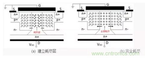 垂直導(dǎo)電N+區(qū)夾在兩邊的P區(qū)中間,當(dāng)MOS關(guān)斷時(shí),形成兩個(gè)反向偏置的PN結(jié):P和垂直導(dǎo)電N+、P+和外延epi層N-。柵極下面的的P區(qū)不能形成反型層產(chǎn)生導(dǎo)電溝道,P和垂直導(dǎo)電N+形成PN結(jié)反向偏置,PN結(jié)耗盡層增大,并建立橫向水平電場;同時(shí),P+和外延層N-形成PN結(jié)也是反向偏置形,產(chǎn)生寬的耗盡層,并建立垂直電場。由于垂直導(dǎo)電N+區(qū)摻雜濃度高于外延區(qū)N-的摻雜濃度,而且垂直導(dǎo)電N+區(qū)兩邊都產(chǎn)生橫向水平電場,這樣垂直導(dǎo)電的N+區(qū)整個(gè)區(qū)域基本上全部都變成耗盡層,即由N+變?yōu)镹-,這樣的耗盡層具有非常高的縱向的阻斷電壓,因此,器件的耐壓就取決于高摻雜P+區(qū)與低摻雜外延層N-區(qū)的耐壓。