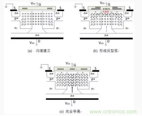 當(dāng)MOS導(dǎo)通時(shí),柵極和源極的電場將柵極下的P區(qū)反型,在柵極下面的P區(qū)產(chǎn)生N型導(dǎo)電溝道,同時(shí),源極區(qū)的電子通過導(dǎo)電溝道進(jìn)入垂直的N+區(qū),中和N+區(qū)的正電荷空穴,從而恢復(fù)被耗盡的N+型特性,因此導(dǎo)電溝道形成,垂直N+區(qū)摻雜濃度高,具有較低的電阻率,因此導(dǎo)通電阻低。