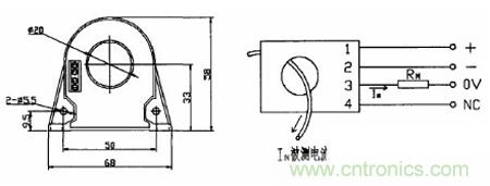 本系統(tǒng)選用的是宇森CBH100SF 型號(hào)的閉環(huán)霍爾電流傳感器。測(cè)量頻率是0-100KHz,額定電流100A,測(cè)量范圍:0-±150A,匝數(shù)比1:1000,精度0.2%-1%,相應(yīng)時(shí)間:《lus。結(jié)構(gòu)如圖3-3 所示: