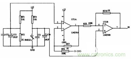 環(huán)境溫度的測(cè)量選用一種新穎的溫度傳感器LM35,其特點(diǎn)是輸出電壓與環(huán)境攝氏溫度成正比,集成電路內(nèi)部己經(jīng)校正,無(wú)需外部校正。靈敏度為10.0mV/℃,精度可達(dá)0.5℃,工作電壓范圍4V-30V,耗電極少,輸出阻抗低。自此使用LM35 滿量程[55℃,150℃]連接方法。為了防止零下溫度時(shí),輸出負(fù)壓,不便于采樣到DSP 中,設(shè)計(jì)了一個(gè)減法器電路。調(diào)整為環(huán)境溫度在[-45℃,75℃]范圍內(nèi),輸出電壓是[0,4.5V]。