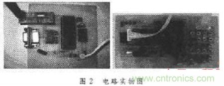對應于上述框圖的電路實物圖如圖2所示。其左右兩個電路分別對應上述框圖中的左右兩個部分??傮w來說,它包括電平轉換電路、單片機處理部分、無線收發(fā)部分(CCll00收發(fā)器 )、液晶顯示模塊和鍵盤輸入模塊五個部分。