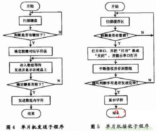單片機程序主要包括主程序、單片機發(fā)送子程序、單片機接收子程序、液晶顯示子程序、鍵盤輸入子程序五部分,均采用C語言進行模塊化編程。由于篇幅原因,下面只給出了單片機發(fā)送子程序和接收子程序,如圖4,圖5所示。