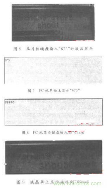 測試時,連接好硬件打開串行口COM1,并設波特率為9600b/s.單片機發(fā)送字符串“675”給PC機,其液晶顯示如圖6所示,相應的PC機界面顯示如圖7所示。PC機發(fā)送“69asd”給單片機,液晶屏上即可接收到“69asd”,如圖8,圖9所示。測試結果說明:基于串行口的PC機與單片機之間的雙工無線通信是切實可行的,而且無線傳輸的距離至少可達到100m.