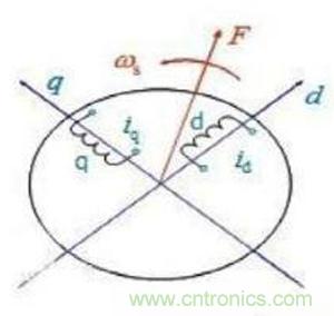 當(dāng)圖1和2的兩個(gè)旋轉(zhuǎn)磁動(dòng)勢大小和轉(zhuǎn)速都相等時(shí),即認(rèn)為圖2的兩相繞組與圖1的三相繞組等效。圖3兩個(gè)匝數(shù)相等且互相垂直的繞組d 和q,其中分別通以直流電流id和iq,產(chǎn)生合成磁動(dòng)勢F,其位置相對(duì)于繞組來說是固定的。如果讓包含兩個(gè)繞組在內(nèi)的整個(gè)鐵心以同步 轉(zhuǎn)速旋轉(zhuǎn),則磁動(dòng)勢F自然也隨之旋轉(zhuǎn)起來,成為旋轉(zhuǎn)磁動(dòng)勢。把這個(gè)旋轉(zhuǎn)磁動(dòng)勢的大小和轉(zhuǎn)速也控制成與圖1 和圖2中的磁動(dòng)勢一樣,那么這套旋轉(zhuǎn)的直流繞組也就和前面兩套固定的交流繞組都等效了。