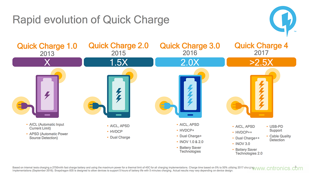 經過不斷地改進,高通的 Quick Charge 2.0/3.0 可以實現“9V 2A”,也就是以最高 18W 的功率進行充電。
