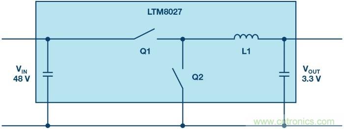 圖1 僅透過一個(gè)轉(zhuǎn)換步驟就從48伏特轉(zhuǎn)換成3.3伏特。