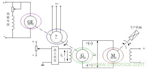 圖中,交流電動機(圖1中的藍色圈顯現(xiàn))為原動機,工作時轉(zhuǎn)速基本恒定。由它拖動的直流發(fā)電機G(圖-1中的綠色圈顯現(xiàn)秒)給需要調(diào)速的直流電動機M(圖1中的紅色圈顯現(xiàn))的電樞供電。GE(圖1中的紫色圈顯現(xiàn))為一臺小型直流發(fā)電機,可以如圖那樣與交流電動機、直流發(fā)電機G同軸相連,也可另設(shè)一臺小型交流電動機對其拖動。它在系統(tǒng)中的作用是提供一小容量的直流電源,供直流發(fā)電機G(圖1中的綠色圈顯現(xiàn))和直流電動機M(圖1中的紅色圈顯現(xiàn))的定子勵磁用,所以又稱GE為勵磁發(fā)電機。