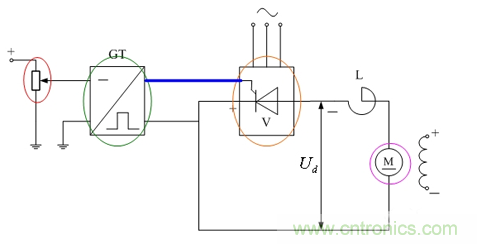 晶閘管整流裝置供電的直流調(diào)速系統(tǒng)如圖。GT(圖2中的綠色圈顯現(xiàn))為晶閘管的觸發(fā)裝置,V(圖2中的橙色圈顯現(xiàn))為晶閘管整流器,合起來為一可控直流電源??煽刂绷麟娫唇o直流電動機M(圖2中的紫色圈顯現(xiàn))電樞供電組成直流調(diào)速系統(tǒng)。這類直流調(diào)速系統(tǒng)簡稱V-M系統(tǒng)。