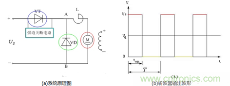 圖3中(a)圖為采用晶閘管做開關(guān)的直流斬波器—電動機調(diào)速系統(tǒng)原理圖。