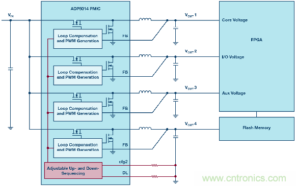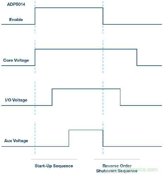 圖2. ADP5014 PMIC集成了對(duì)靈活控制上電/關(guān)斷時(shí)序的支持。