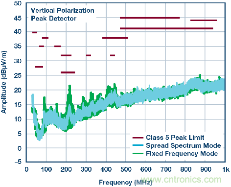 在整個負(fù)載范圍內(nèi),LT8645S可以輕松符合汽車CISPR25、Class 5峰值EMI限制。還可以使用擴(kuò)頻頻率調(diào)制進(jìn)一步降低EMI水平(圖2)。LT8645S內(nèi)置高效率頂部和底部功率開關(guān),并將必要的升壓二極管、振蕩器以及控制和邏輯電路集成到單個芯片中。低紋波突發(fā)工作模式可在低輸出電流下保持高效率,同時使輸出紋波低于10 mV p-p。最后,LT8645S采用小尺寸散熱增強(qiáng)型4 mm×6 mm、32引腳LQFN封裝。