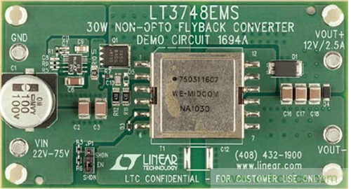 圖 3 示出了一款采用 LT3748 的演示電路板。該電路可接受一個范圍從 22V 至 75V 的 輸 入 電 壓, 并 在 高達 2.5A 的電流條件下產(chǎn)生一個隔離型12V 輸出。