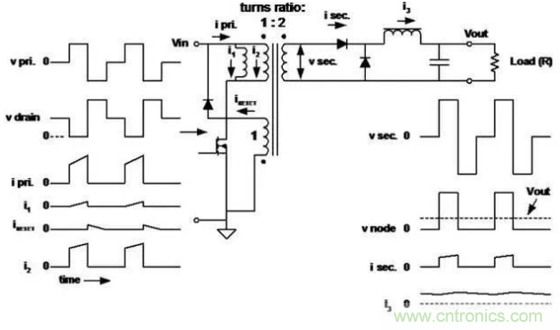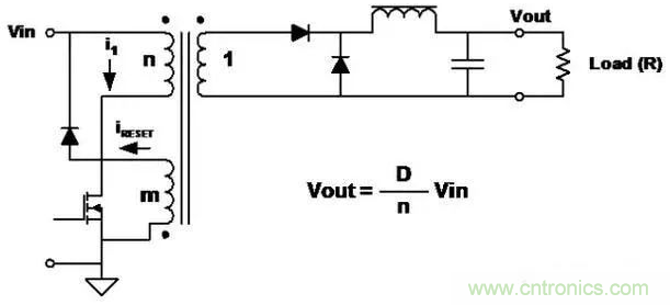 ■在每個(gè)開關(guān)周期中必須對(duì)變壓器磁芯去磁。常用的做法是增加一個(gè)與初級(jí)繞組匝數(shù)相同的繞組。