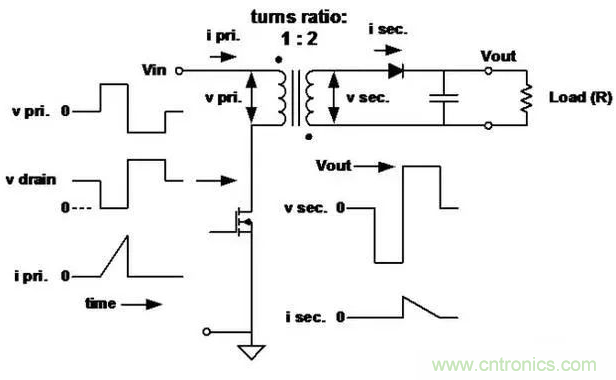 ■此處初級(jí)電感很低,用于確定峰值電流和存儲(chǔ)的能量。當(dāng)初級(jí)開關(guān)斷開時(shí),能量傳送到次級(jí)。