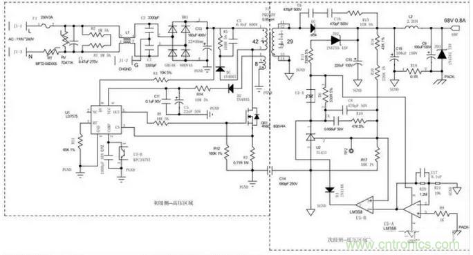 2、若反饋回路失效,輸出末端加穩(wěn)壓二極管,當輸出遠高出設定電壓,穩(wěn)壓二極管反向擊穿,使輸出正負極形成短路,使初級啟動短路保護或熔斷保險保護。