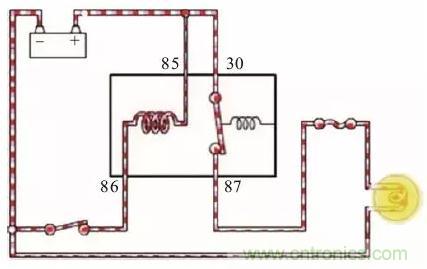 車輛繼電器多為四腳,工作原理如下圖所示。當(dāng)開關(guān)閉合后電流從蓄電池正極經(jīng)過繼電器的85#線圈端子從86#流回蓄電池的負(fù)極,線圈兩端就會產(chǎn)生磁場。線圈產(chǎn)生磁場后,就會吸引觸點的87#和30#端子,使繼電器的觸點閉合,從而實現(xiàn)小電流控制大電流。