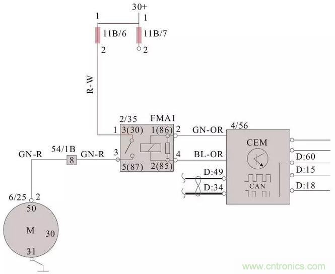 繼電器在汽車電路中的應(yīng)用非常廣泛。如啟動系統(tǒng)電路、雨刮器電路、后窗加熱電路等。車輛啟動時需要大的啟動電流,如果使用點火開關(guān)直接控制大電流經(jīng)過的點火開關(guān),啟動觸點會出現(xiàn)觸點打火、燒蝕等現(xiàn)象,影響點火開關(guān)使用壽命甚至?xí)斐删€路燒蝕、起火等嚴(yán)重后果。使用繼電器以小電流控制大電流則不會出現(xiàn)以上問題。