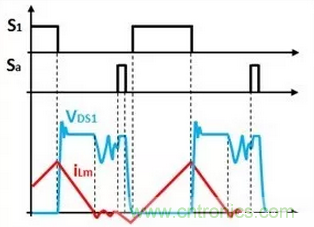 在主開關(guān)管開通前,先開通輔助繞組的開關(guān)管,輔助電源對輔助繞組進(jìn)行電流反灌,將能量儲存在變壓器中;輔助繞組的開關(guān)管關(guān)斷后,變壓器儲存的能量抽取主開關(guān)管COSS的能量,COSS放電電壓降低,直到其內(nèi)部體二極管導(dǎo)通,這時候開通主開關(guān)管,就能實現(xiàn)零電壓開通ZVS。