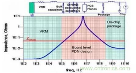 在調(diào)試該故障前先回顧下電源噪聲抑制的原理。如下圖所示,電源分配網(wǎng)絡(luò)中不同的頻段由不同的元件來抑制噪聲,去耦元件包含電源調(diào)整模塊(VRM)、去耦 電容、PCB電源地平面對、器件封裝和芯片。VRM包含電源芯片及外圍的輸出電容,大約作用于DC到低頻段(100K左右),其等效模型是一個電阻和一個 電感組成的二元件模型。去耦電容最好使用多個數(shù)量級容值的電容配合使用,充分覆蓋中頻段(數(shù)10K到100M左右)。由于布線電感和封裝電感的存在,即時 大量堆砌去耦電容也難以在更高頻起到作用。PCB電源地平面對形成了一個平板電容,也具有去耦作用,大約作用在數(shù)十兆。芯片封裝和芯片負責高頻段 (100M以上),目前的高端器件一般會在封裝上增加去耦電容,此時PCB上的去耦范圍可以降低到數(shù)十兆甚至幾兆。因此,在電流負載不變的情況下,我們只 要判斷出電壓噪聲出現(xiàn)在哪個頻段,那么針對這個頻段所對應(yīng)的去耦元件進行優(yōu)化即可。在兩個去耦元件的相鄰頻段時兩個去耦元件會配合作用,所以在分析去耦元 件臨界點時相鄰頻段的去耦元件也要同時納入考慮。