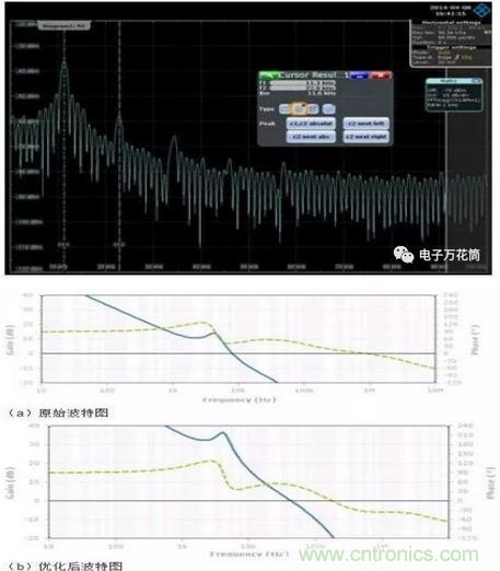 一般來說,11.3KHz應(yīng)該是VRM的管轄范圍,此處出現(xiàn)較大噪聲說明VRM電路設(shè)計不能滿足 要求。這里對VRM的性能進行分析,VRM分析的方法眾多,此處主要采用仿真其反饋環(huán)路波特圖的手段。波特圖主要觀察幾個關(guān)鍵信息:1、穿越頻率,增益曲 線穿越0dB線的頻率點;2、相位裕度,相位曲線在穿越頻率處所對應(yīng)的相位值;3、增益裕度,相位在-360°時所對應(yīng)的增益值。這里我們主要關(guān)注穿越頻 率和相位裕度這兩個指標。從VRM的環(huán)路波特圖(如下圖a)可以看到,VRM的穿越頻率在8KHz左右,相位裕度37度。這里存在兩個問題:首先VRM的 相位裕度一般需要大于45度才能保證環(huán)路的穩(wěn)定工作,這里相位裕度稍小一些,需要增加相位裕度;其次穿越頻率太低,穿越頻率附近VRM的調(diào)整作用逐漸降低,而此頻點bulk電容還起不到作用,所以在8KHz附近會存在較高的阻抗,這個頻點的噪聲抑制作用較差。下圖(b)是優(yōu)化VRM環(huán)路之后的波特圖,調(diào)整相位裕度到50度,穿越頻率推到46KHz左右。