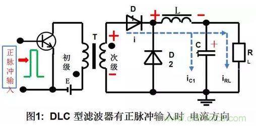 b. 輸入正脈沖消失,負(fù)載RL的電流由兩路提供,一路是C2放電提供的電流為-ic2,,另一路是由電感L儲(chǔ)存的磁能轉(zhuǎn)換成電能,并與C1上的電壓串聯(lián)后提供-ic1。負(fù)載RL中的電流等于兩個(gè)電容器放電電流的和,即IL= -(ic2+ic1)