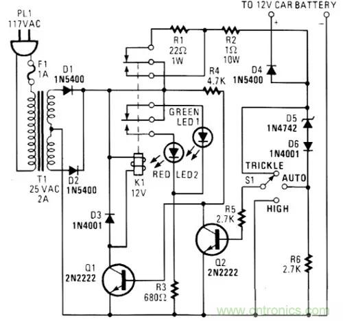 不管是一個(gè)低電流(50毫安),還是高電流(1安培),該電路都有能力提供。你可以選擇手動(dòng)充電或者自動(dòng)模式。當(dāng)電流很低的時(shí)候,你可以在選擇高電流充電之前先用低電流。如果電池的電壓過低,齊納二極管D5將有足夠的電流來產(chǎn)生一個(gè)穿過R6的電壓從而使得Q2開啟。