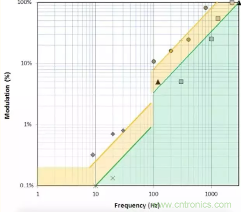 電氣和電子工程師協會1789-2015年標準首次提出降低人體健康風險的全面建議。上圖顯示的是對人體健康風險較低或無明顯風險(綠色部分)的整個頻率范圍內的頻閃限值曲線?! ?/div>