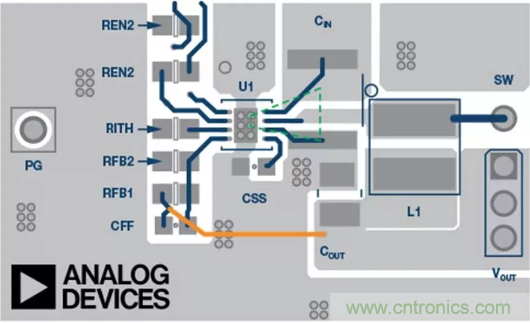 圖2所示為ADP2360的示例布局。在本圖中,圖1中的重要熱回路標為綠色。從圖中可見,黃色反饋路徑離線圈L1有一定距離。它位于PCB的內(nèi)層。