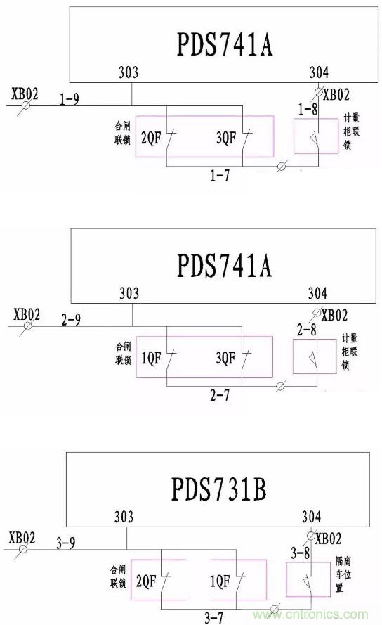 在計量柜與母聯(lián)隔離柜都到位的情況下,合1QF與2QF。這時PDS731B的3-7與3-9處于分?jǐn)嗟臓顟B(tài),其304端子無電源,3QF不滿足合閘條件。同理,1QF與3QF合閘時,2QF不滿足合閘條件;2QF與3QF合閘時,1QF不滿足合閘條件。