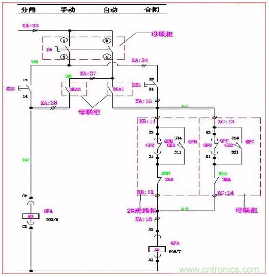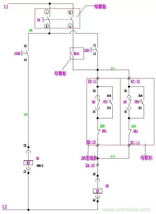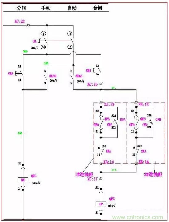 手動時:萬轉(zhuǎn)SA的1、2腳連通。當(dāng)Q2、Q3合閘,Q1合閘回路A-2、A-3斷開,其合閘線圈XF無法得電, Q1不能滿足合閘條件;同理,當(dāng)Q1、Q2或Q1、Q3同時合閘時,Q2或Q3也同樣不能滿足合閘條件。使進線柜與母聯(lián)滿足“三合二”邏輯。