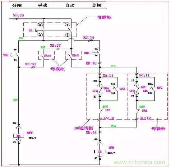 手動時:當(dāng)QFA、QFB合閘,QFC合閘回路C-1、C-2斷開,其合閘線圈XF無法得電, QFC不能滿足合閘條件;同理,當(dāng)QFA、QFC或QFB、QFC同時合閘時,QFB或QFA也同樣不能滿足合閘條件。使進線柜與母聯(lián)滿足“三合二”邏輯。