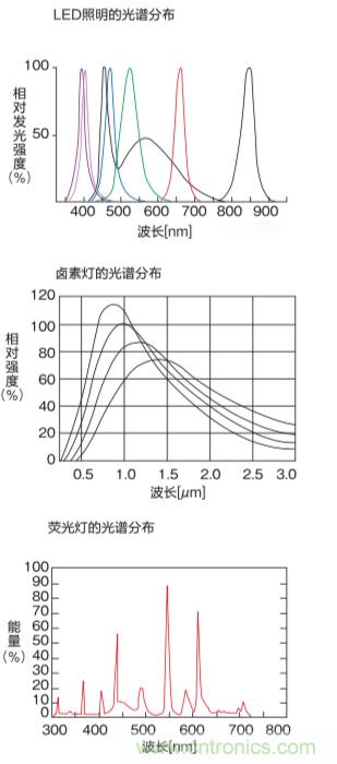 當(dāng)然就算你的響應(yīng)速度再快、消耗電流更小、壽命更長但如果光譜分布不好也是有問題的,所以下面我們看一下LED的顏色光譜分布情況。首先要說明LED照明的光譜分布不像熒光燈、鹵素?zé)裟菢硬ㄩL分布較寬,每個LED照明發(fā)光波長可謂某個固定的特定波長。