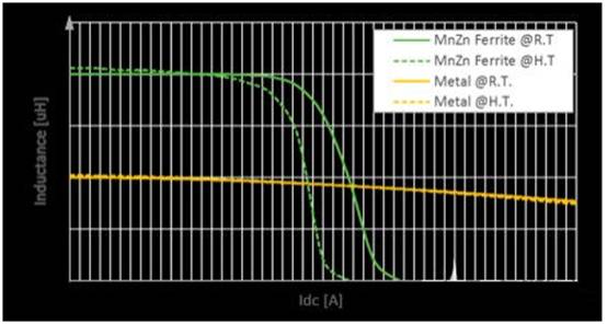 圖2.金屬?gòu)?fù)合材料和鐵氧體磁芯電感飽和度的比較。