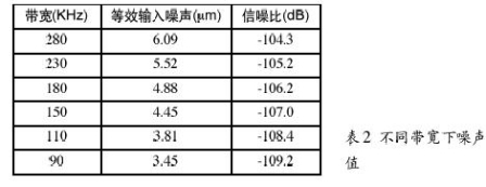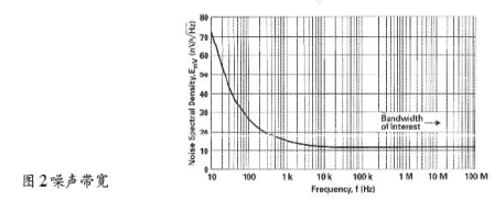 噪聲值—當(dāng)運(yùn)放作為有源器件時,RF噪聲值與運(yùn)放噪聲是一回事。熱噪聲有一定影響,但RF電路使用的電阻通常較小,它們的噪聲可忽略不計。運(yùn)放RF電路的噪聲與增益和帶寬有關(guān)。例如,使用一個運(yùn)放,應(yīng)用于10.7MHz中放,信號電平0dBV,增益為1,噪聲譜密度如圖2所示。此外,帶寬越窄,噪聲越低,見表2。