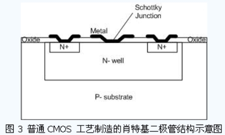 在一般的無(wú)源UHF RFID 標(biāo)簽的應(yīng)用中,出于成本的考慮,希望芯片電路適合于普通CMOS工藝的制造。而遠(yuǎn)距離讀寫的要求對(duì)電源恢復(fù)電路的功率轉(zhuǎn)換效率提出了較高的要求。為此,很多設(shè)計(jì)者采用標(biāo)準(zhǔn)CMOS 工藝來實(shí)現(xiàn)肖特基勢(shì)壘二極管,從而可以方便地采用多級(jí)Dickson倍壓電路結(jié)構(gòu)來提高電源轉(zhuǎn)換的性能。圖3 所示是普通CMOS 工藝制造的肖特基二極管結(jié)構(gòu)示意圖。在設(shè)計(jì)中,不需要更改工藝步驟和掩膜板生成規(guī)則,只需在版圖上作一些修改,就可以制作出肖特基二極管。