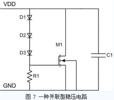 在RFID 標(biāo)簽芯片中,需要有一個(gè)較大電容值的儲(chǔ)能電容存儲(chǔ)足夠的電荷以供標(biāo)簽在接收調(diào)制信號(hào)時(shí),仍可在輸入能量較小的時(shí)刻(例如OOK調(diào)制中無(wú)載波發(fā)出的時(shí)刻),維持芯片的電源電壓。如果輸入能量過高,電源電壓升高到一定程度,穩(wěn)壓電路中電壓感應(yīng)器將控制泄流源將儲(chǔ)能電容上的多余電荷釋放掉,以此達(dá)到穩(wěn)壓的目的。圖7 是其中一種并聯(lián)型穩(wěn)壓電路。三個(gè)串聯(lián)的二極管D1、D2、D3 與電阻R1 組成電壓感應(yīng)器,控制泄流管M1 的柵極電壓。當(dāng)電源電壓超過三個(gè)二極管開啟電壓之和后,M1 柵極電壓升高,M1 導(dǎo)通,開始對(duì)儲(chǔ)能電容C1 放電。